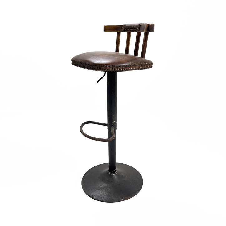 Brown Aged Studded Leather & Wood Curved Top Stool with Black Metal Base
